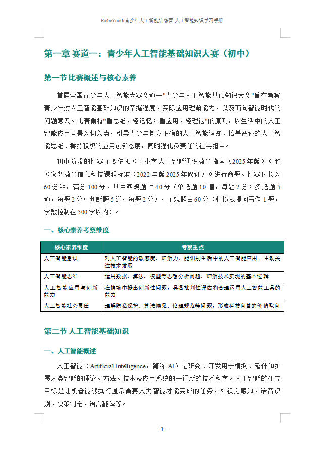 首届全国青少年人工智能大赛(初中组赛道一、赛道二、赛道三高中组赛道二)人工智能知识学习手册,赛前特训内部手册。
