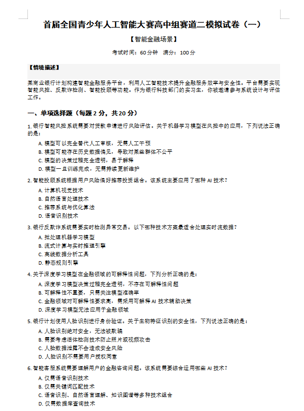 首届全国青少年人工智能大赛高中组【赛道二】模拟试题(5套附答案)