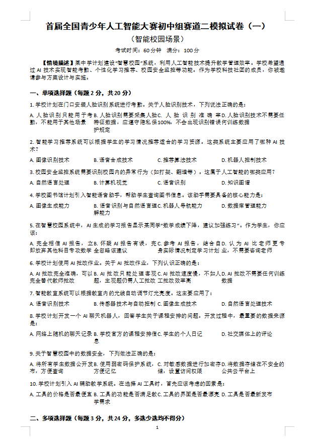 首届全国青少年人工智能大赛初中组【赛道二】模拟试题(5套附答案)