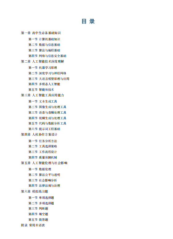 首届全国青少年人工智能大赛・高中赛道二学习手册,系统覆盖高中生必备 AI 知识与工具应用能力。从计算机基础、数据算法、网络安全讲起,深入解析机器学习、深度学习、大语言模型、多模态 AI 与智能体技术;重点讲解文本、图像、音视频、代码等 AI 工具实操,配套提示词工程与人机协作方案设计;同时强化 AI 伦理、数据安全、算法公平与法律法规,附全真模拟题与术语表。内容贴合赛事考点,兼顾原理与实操,帮助青少年快速掌握 AI 工具用法、建立规范认知,是备赛与 AI 入门的权威实用指南。